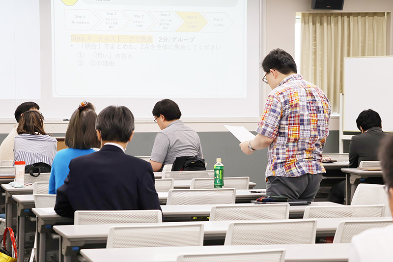 前回同様ジグソー法を活用し、まず各々が立てた「問い」に対して個人で向き合った後、グループで『教育活動の前・中・後で行う評価』をーテーマに意見交換。「より正確に、より適切に、より高い信頼性を持って」評価するための糸口を探していきました。続いて、評価の選択肢を増やすことを目的に、隣り合ったグループでクロストーク。最後に、改めて教員一人ひとりが個々で立てた『問い』に対する答えを導き出していきました。