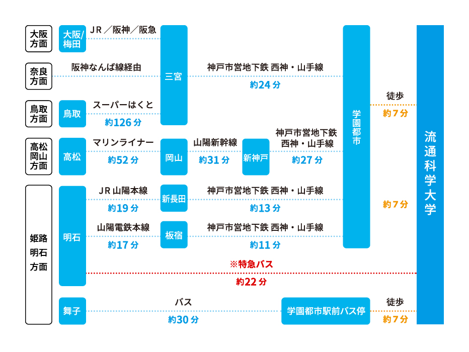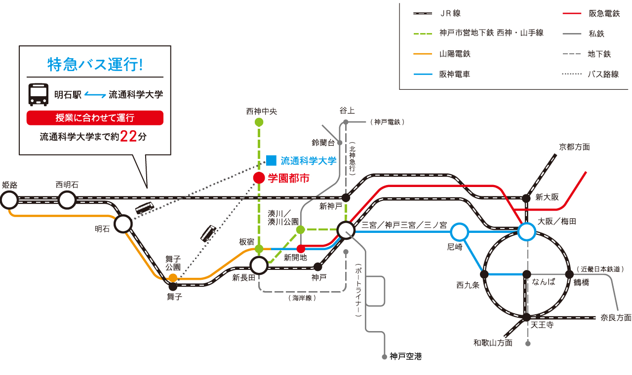 姫路や加古川、高砂から通学するには、JRか山陽電車を利用し途中で地下鉄かバスに乗り換えますが、私は明石駅から特急バスに乗車。道が空いているときは22分、朝のラッシュ時でも30分くらい。バス停も大学のすぐ近くなので快適です。