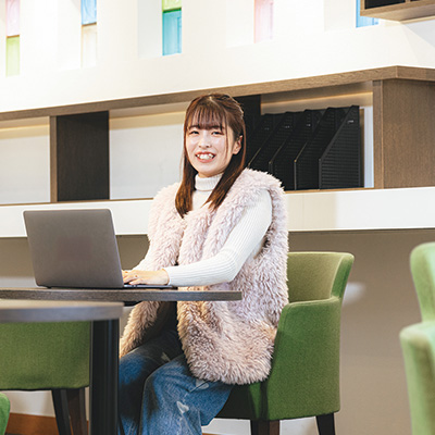 このコースの魅力は、プログラミングなど専門的な情報知識を深く学べること。「データベース」の授業ではExcelの使い方を身につけ、今ではグラフを作るなど自由に使いこなせるようになりました。ほかにも私は、ネットでのトラブル例や対処法を学ぶ「ネットコミュニケーション」、身を守るための法律知識を学ぶ「民法A」など、普段の生活にも役立ちそ うな授業を好んで取っています。将来は、授業で学んだ知識を生かして、信用金庫など地域の方々のお悩みを解決するような仕事に就きたいと考えています。